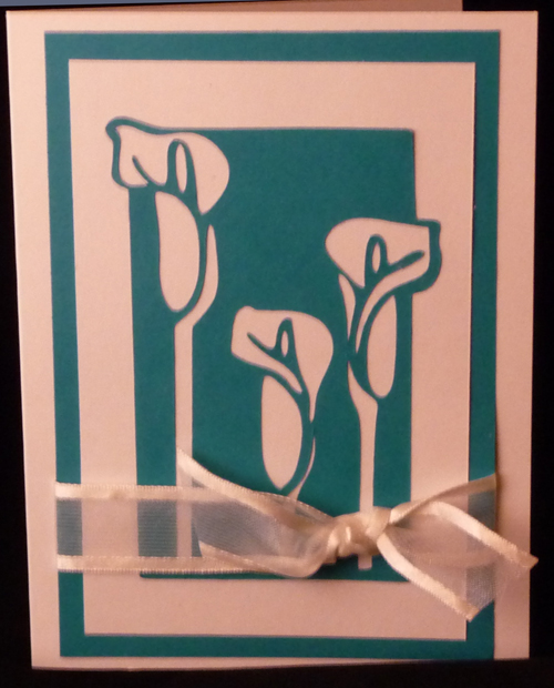 I was looking at pictures of quilts and saw a beautiful quilt of Cala L:ilies. Inspired me to make a cut file patterned after the quilt. the top card is just the cut image layered on paper and has a simple ribbon. The bottom card is the cut image on top of white vellum then layered on paper with a bow and pearls.
